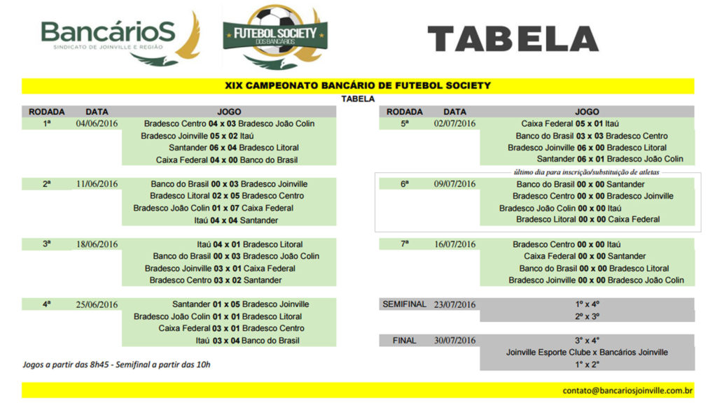 Neste sábado, 2/7, foi realizada a quinta rodada do Campeonato Bancário de Futebol Society, promovida pelo Bancários Joinville. Numa bela manhã de goleadas, começa a se formar o quadrangular final do campeonato. Quatro equipes, três diferentes bancos avançam na tabela. O Bradesco Joinville permanece firme na liderança seguido de perto pela Caixa, e Bradesco Centro vem logo atrás, sentindo a aproximação do Santander. São as semanas finais do campeonato, momentos decisivos!