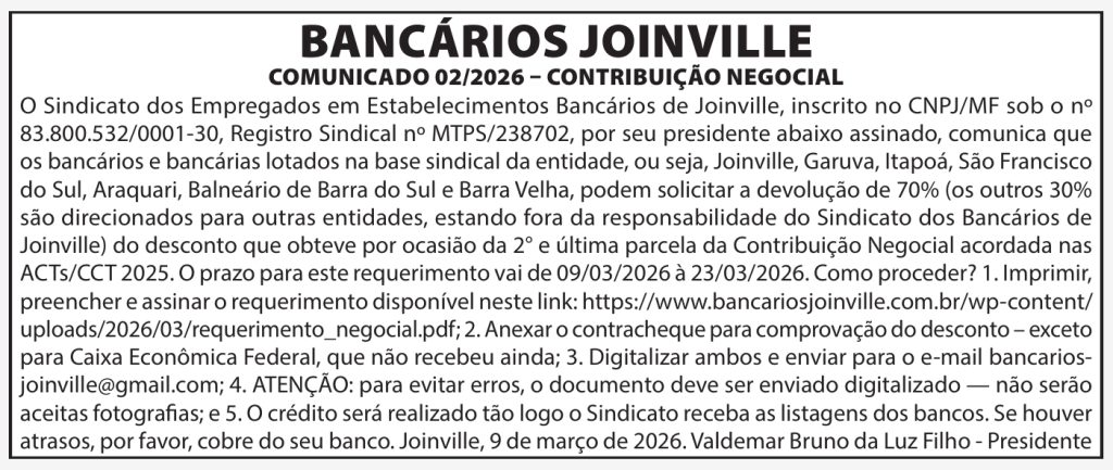 O Sindicato dos Empregados em Estabelecimentos Bancários de Joinville, inscrito no CNPJ/MF sob o nº 83.800.532/0001-30, Registro Sindical nº MTPS/238702, por seu presidente abaixo assinado, comunica que os bancários e bancárias lotados na base sindical da entidade, ou seja, Joinville, Garuva, Itapoá, São Francisco do Sul, Araquari, Balneário de Barra do Sul e Barra Velha, podem solicitar a devolução de 70% (os outros 30% são direcionados para outras entidades, estando fora da responsabilidade do Sindicato dos Bancários de Joinville) do desconto que obteve por ocasião da 2° e última parcela da Contribuição Negocial acordada nas ACTs/CCT 2025. O prazo para este requerimento vai de 09/03/2026 à 23/03/2026.