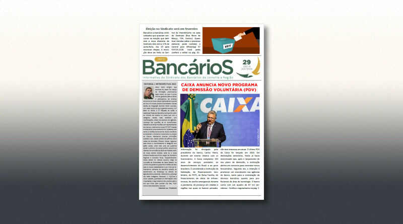 Info BancáriosSindicato Info Bancários # 29 15 de janeiro de 2024 webmaster 648 visualizações Ed.29: Caixa anuncia novo Programa de Demissão Voluntária (PDV) [ Clique aqui para baixar ]