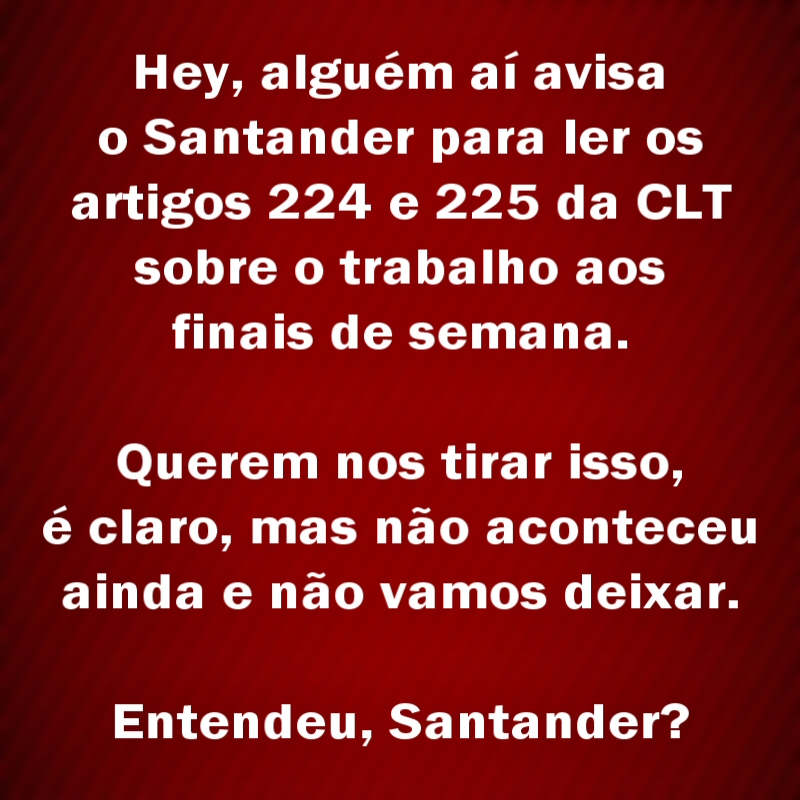 O banco espanhol Santander soltou novo comunicado aos bancários alertando para trabalho nos finais de semana e feriados. A lei é clara, bancário não trabalha sábado, domingo e feriado.