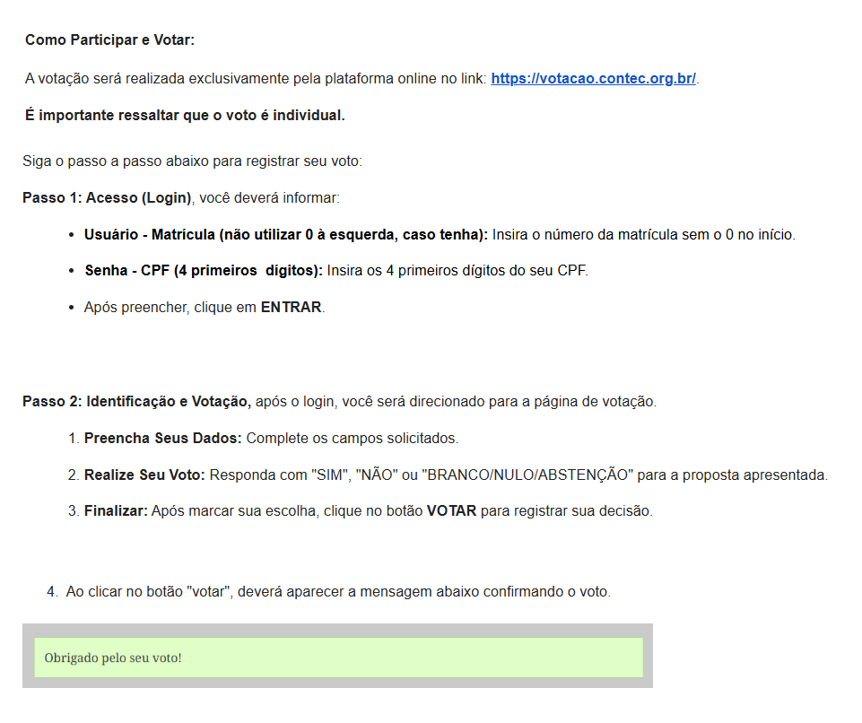 O Sindicato dos Empregados em Estabelecimentos Bancários de Joinville, inscrito no CNPJ/MF sob o nº 83.800.532/0001-30, registrado no Cartório de Registro Civil das Pessoas Naturais, Títulos e Documentos e Pessoas Jurídicas de Joinville, detentor da Carta Sindical nº MTPS 238702, com sede em Joinville, à Rua Nove de Março, nº 724, Centro, Joinville/SC, por seu Presidente, convoca todos os trabalhadores da Caixa Econômica Federal, que são beneficiários titulares do Saúde Caixa, sócios e não sócios, da base territorial deste sindicato (municípios de Joinville, Barra Velha, São Francisco do Sul, Araquari, Garuva, Itapoá e Barra do Sul), para a Assembleia Extraordinária Específica, que se realizará de forma virtual/remota/eletrônica, através do acesso ao link https://votacao.contec.org.br, nos dias 11 e 12 de novembro de 2025, com votação das 19h00 do dia 11.11.2025, e até às 14h00 do dia 12.11.2025 para a deliberação quanto a proposta do Acordo Coletivo de Trabalho Saúde Caixa 2026, com vigência de 1º de janeiro de 2026 a 31 de agosto de 2026.